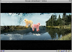 其實兩位作者把Entropy8Zuper包得很密實的,網頁畫面由三個頁框組成,上下兩黑邊定位著中間在變化的shockwave畫面,像在電視上看寬螢幕電影。即使中間畫面換過幾次網頁連線,瀏覽器上的網址永遠是entropy8zuper.org;換句話說,我們不會也不該知道網站的層次安排,我們觸動的是影像故事在眼前的變換,好像,觸動搖控器換電視頻道光碟軌道一樣,是同一層面的移動,而沒有深入空間的感覺。可惜,這個平面感很輕易地被瀏覽器給打破;只要選擇“用新視窗看這個框”,或者“看網頁內碼”,“網頁資訊”,畫面頁在作者伺服器上的層次立刻出現。甚至,可以直接從收藏動畫的檔案夾中,順序叫出動畫觀賞,完全省去作者的敘述。